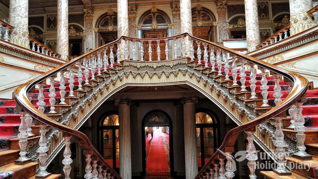 The interior decoration rivals the greatest European palaces. The ceremonial hall features a chandelier weighing 4.5 tons with 750 lamps, reportedly a gift from Queen Victoria. Crystal staircases with mahogany railings, handwoven silk carpets, and paintings by famous European and Ottoman artists adorn the rooms.